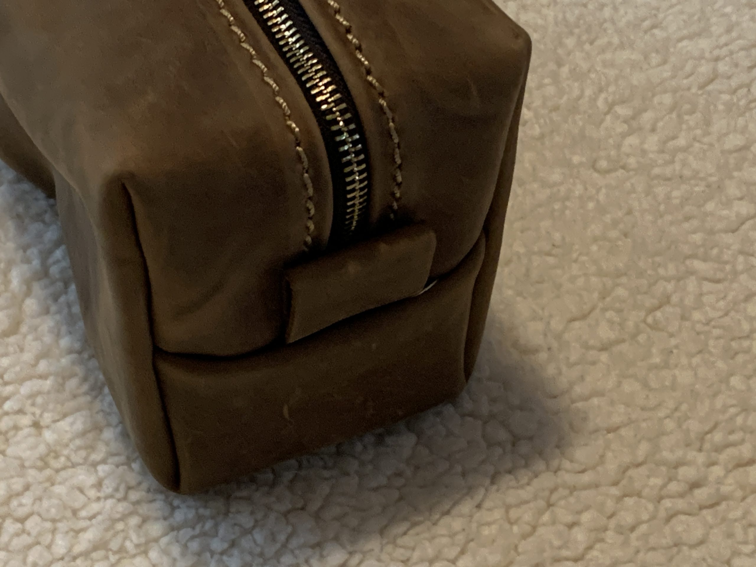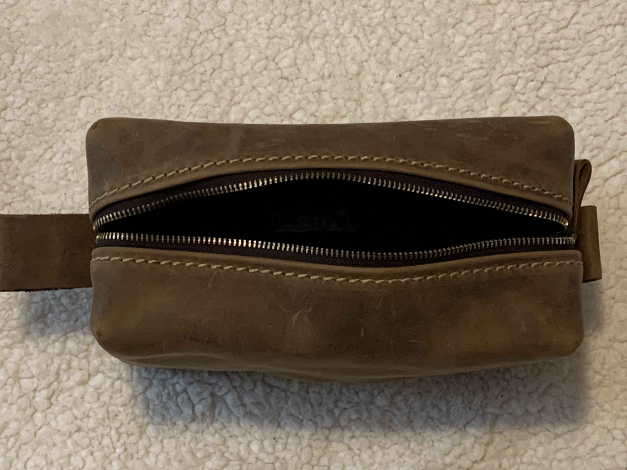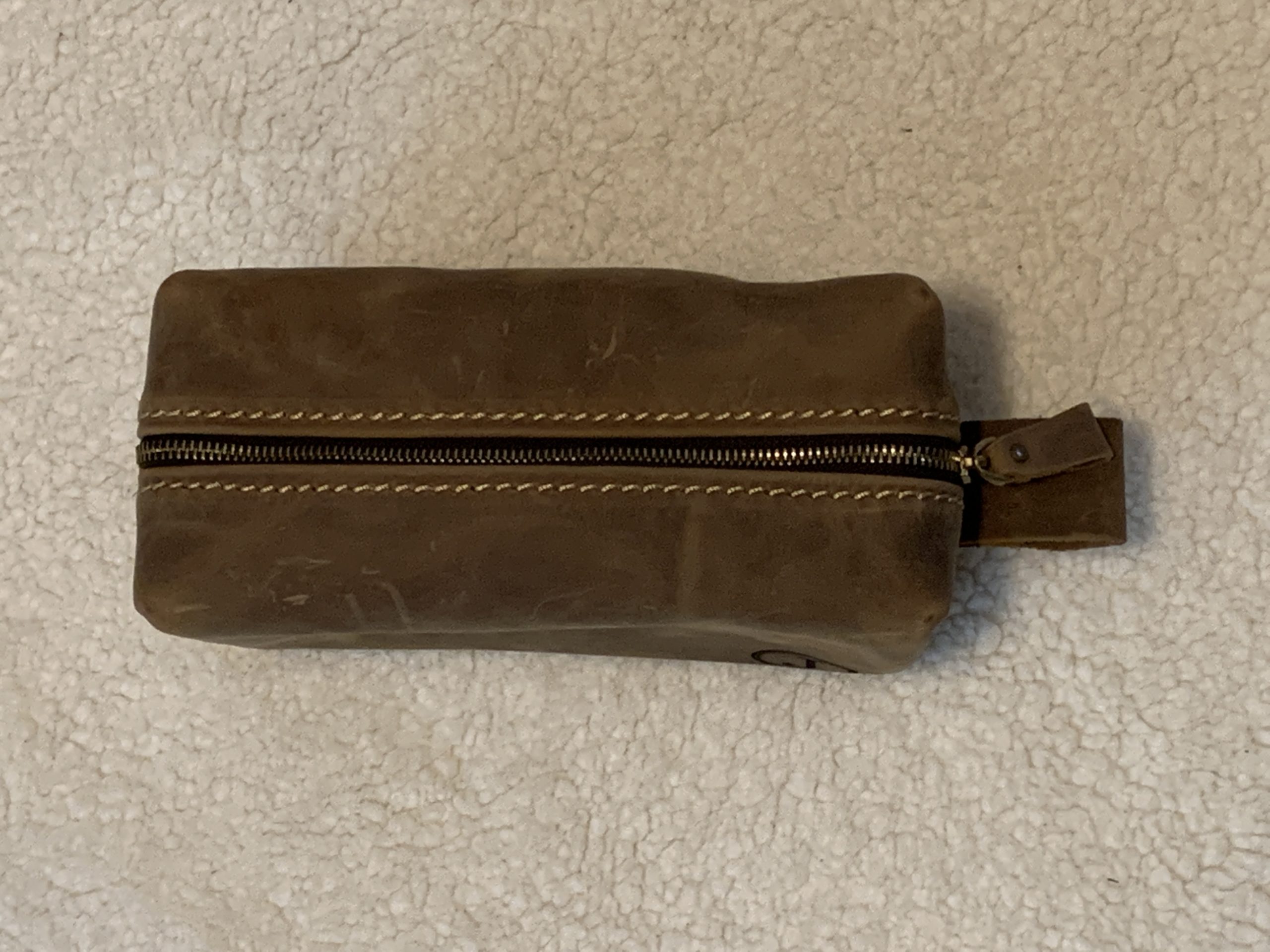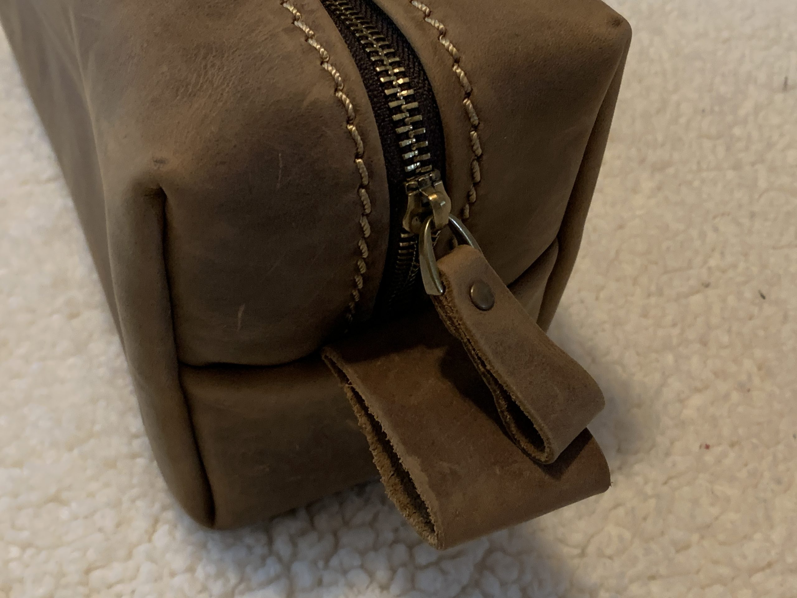 The bag was carefully packaged and shipped. The engraved personalized letter is nicely sized, classic yet modern design. The bag comes lined with a very heavy duty canvas which will protect the leather from the inside. The zipper is almost industrial in construction and will no doubt handle the wear and tear over the years of opening and closing repeatedly. There is a nice leather loop around the zipper handle making it easier to pull in either direction. The stitching around the zipper is made from heavy gauge nylon and provides a nice accenting to the bag. I would give this bag a 5 out of 5 stars!