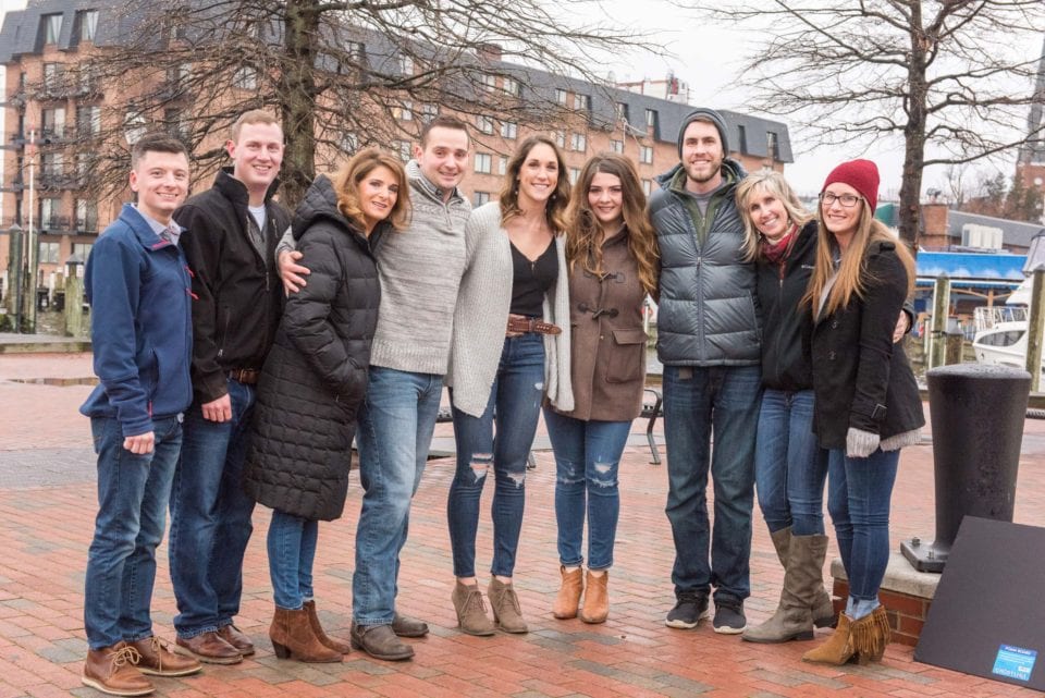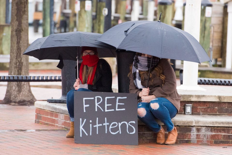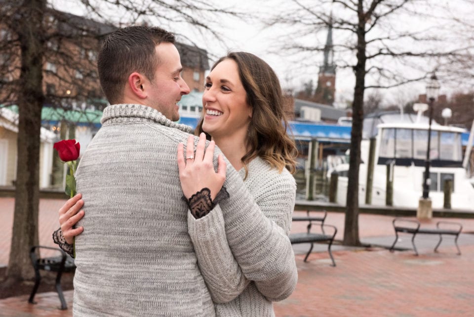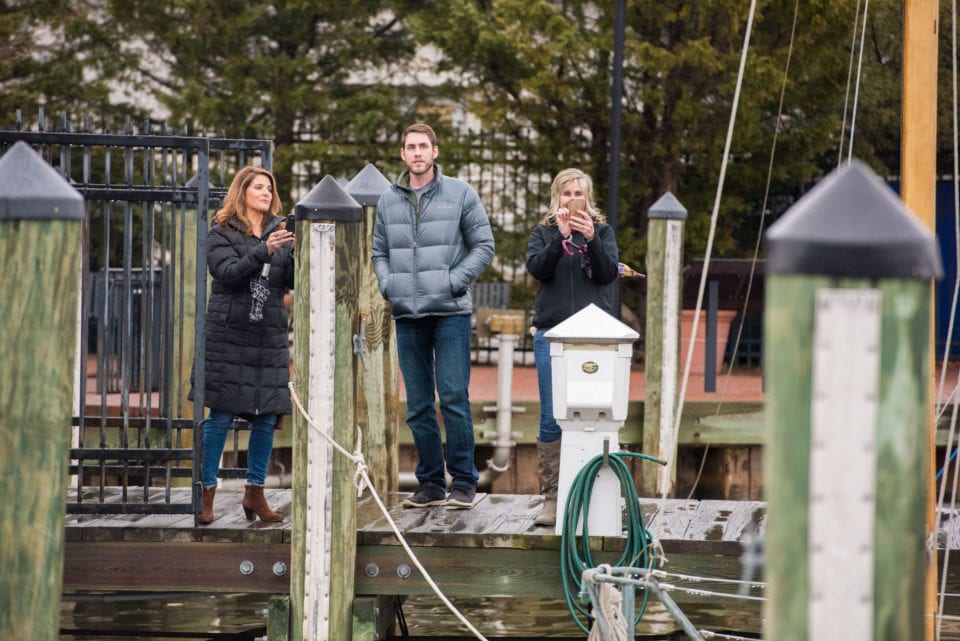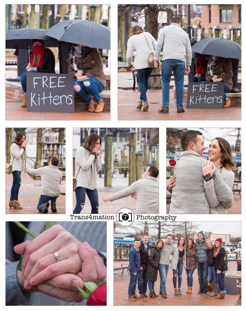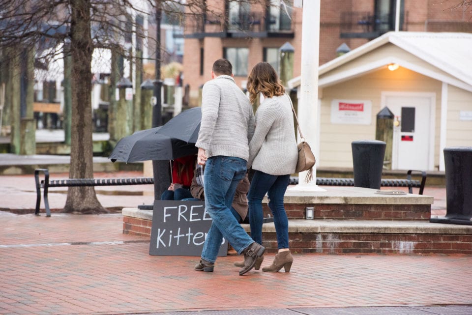 So on this cold, drizzly, January Saturday, Jourdan planned a surprise engagement proposal to Mariah with the help of his friends Chad and David who live in downtown Annapolis near the naval academy. So we used their place, which overlooked the famed Ego Alley, Pussers, and the Annapolis pier as our base of operations. Jourdan, who along with Mariah live in Annapolis, wanted to get down on a knee right near the flag pole facing Eastport. It was here that Chandra and Lydia (Mariah and Jourdan’s sisters, respectively), along with their mothers, brother, Chad and David prepared a “Free Kittens” sign to draw Mariah to the “kitten” box. Meanwhile, family and friends kept an eye out on the location of the Uber driver to get ready for their arrival. The weather let up and the snows never came and the early morning rains had subsided! All systems GO! This was meant to be!