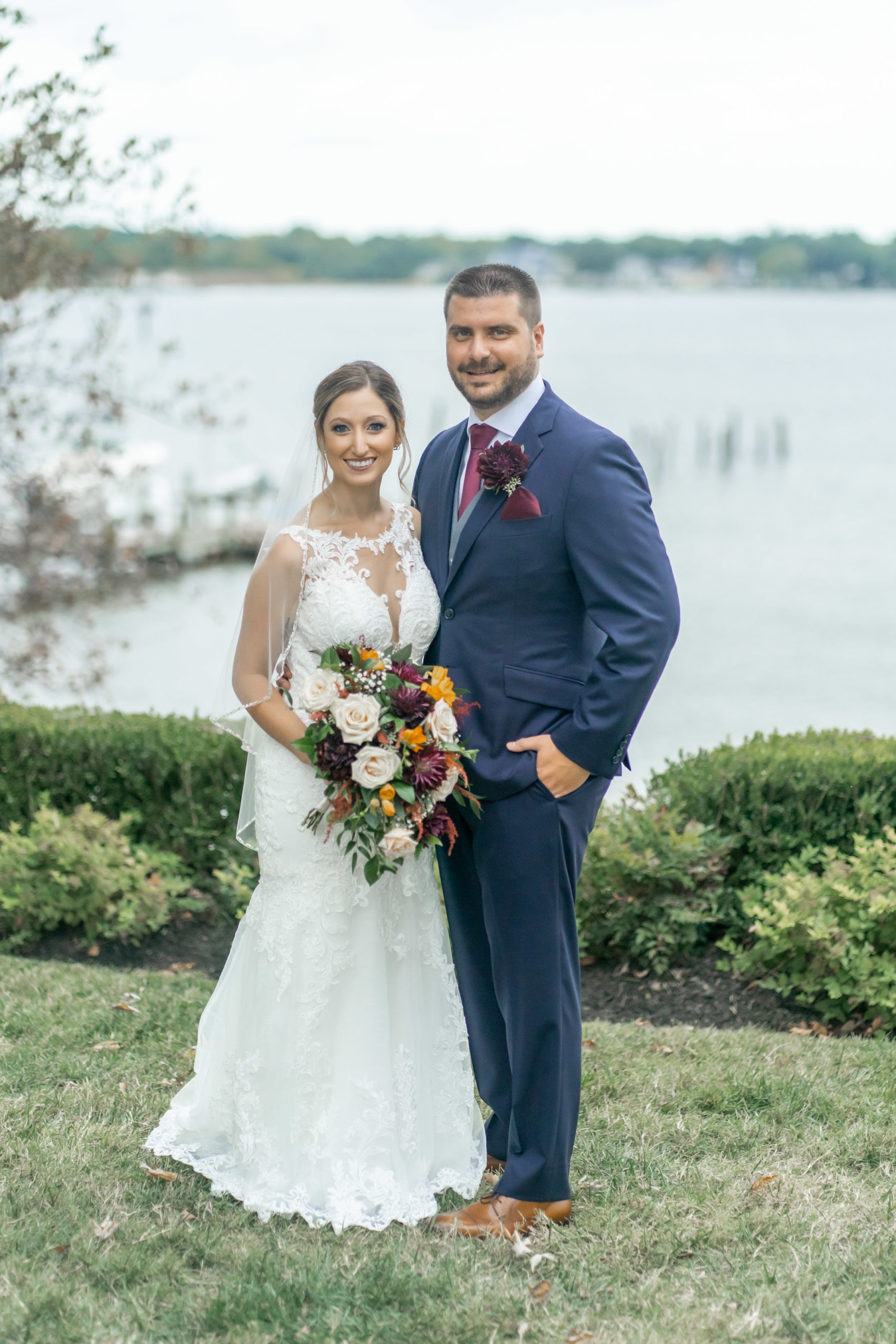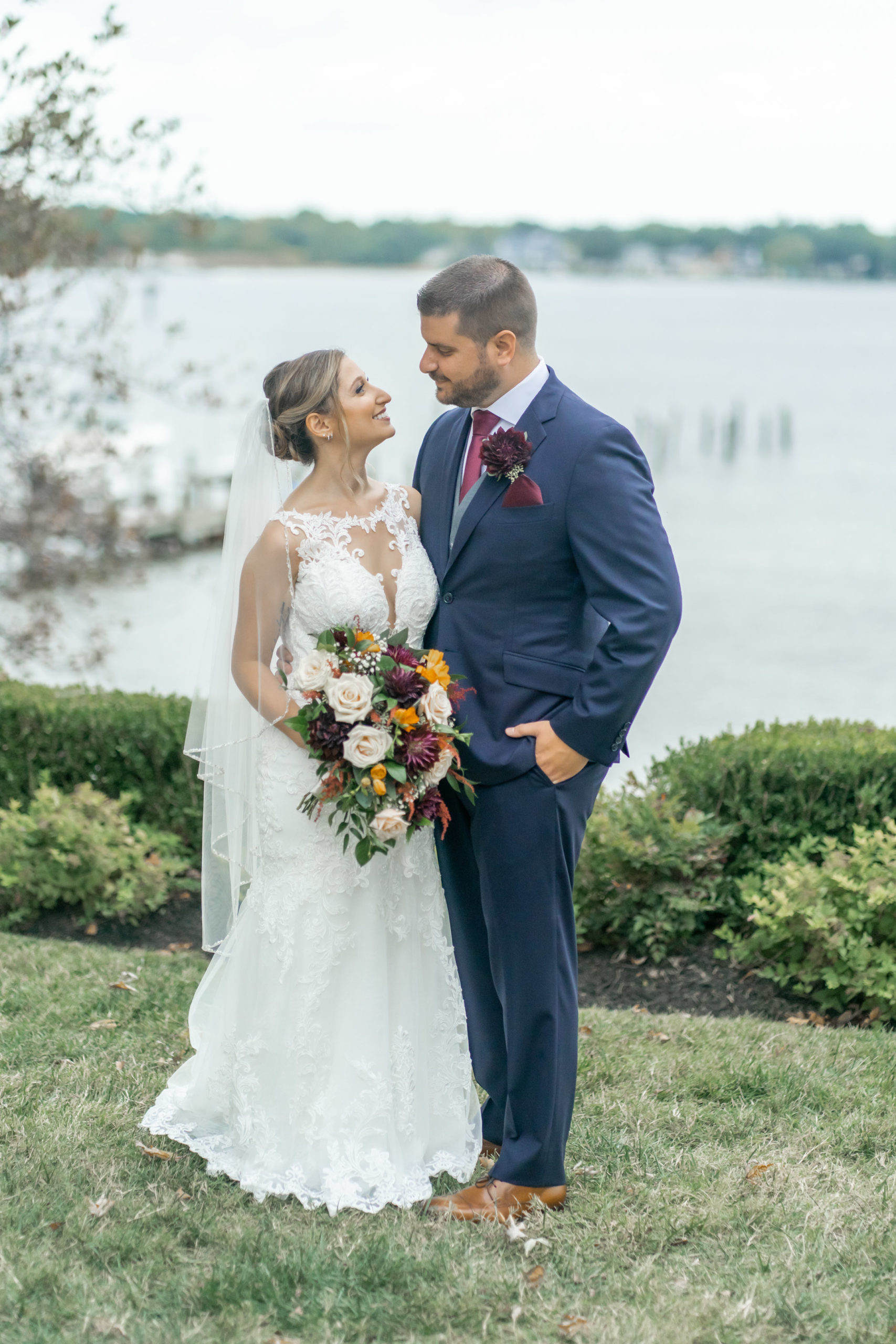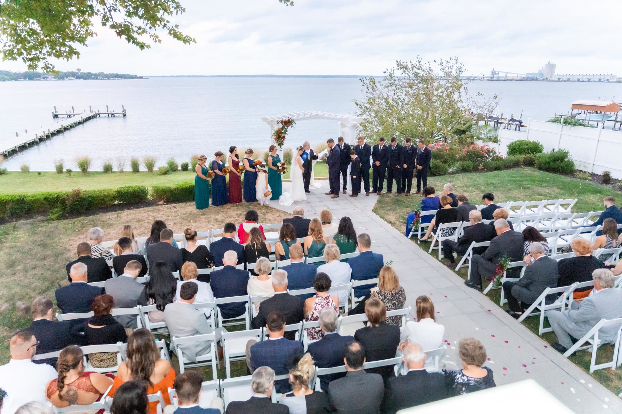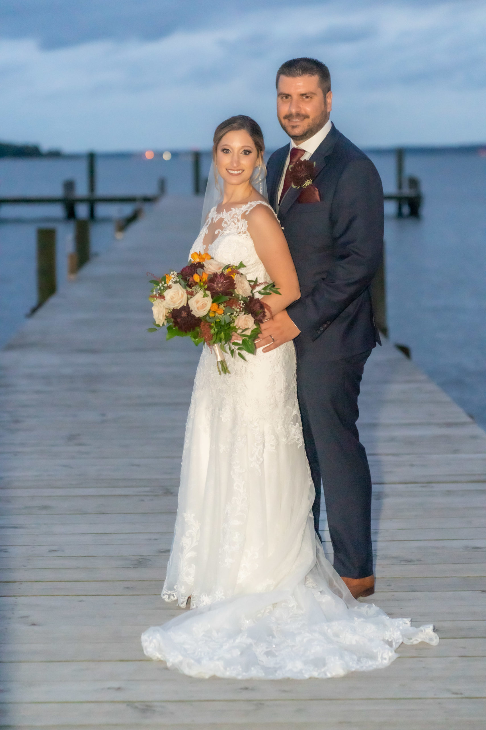 A week ago today, both Rebecca and Patrick, along with their friends and relatives, exchanged their vows and sealed it with a kiss at the beautiful waterfront wedding property known as The Bayfront Club – one of several Catering by Uptown venues in and around Baltimore, Maryland. This venue showcases a beautiful ballroom with windows overlooking the Chesapeake Bay. A large deck overlooks several grass fields, one with an arch for outdoor ceremony. This facility also boasts having a long pier for extra phun, photos, and phestivities!