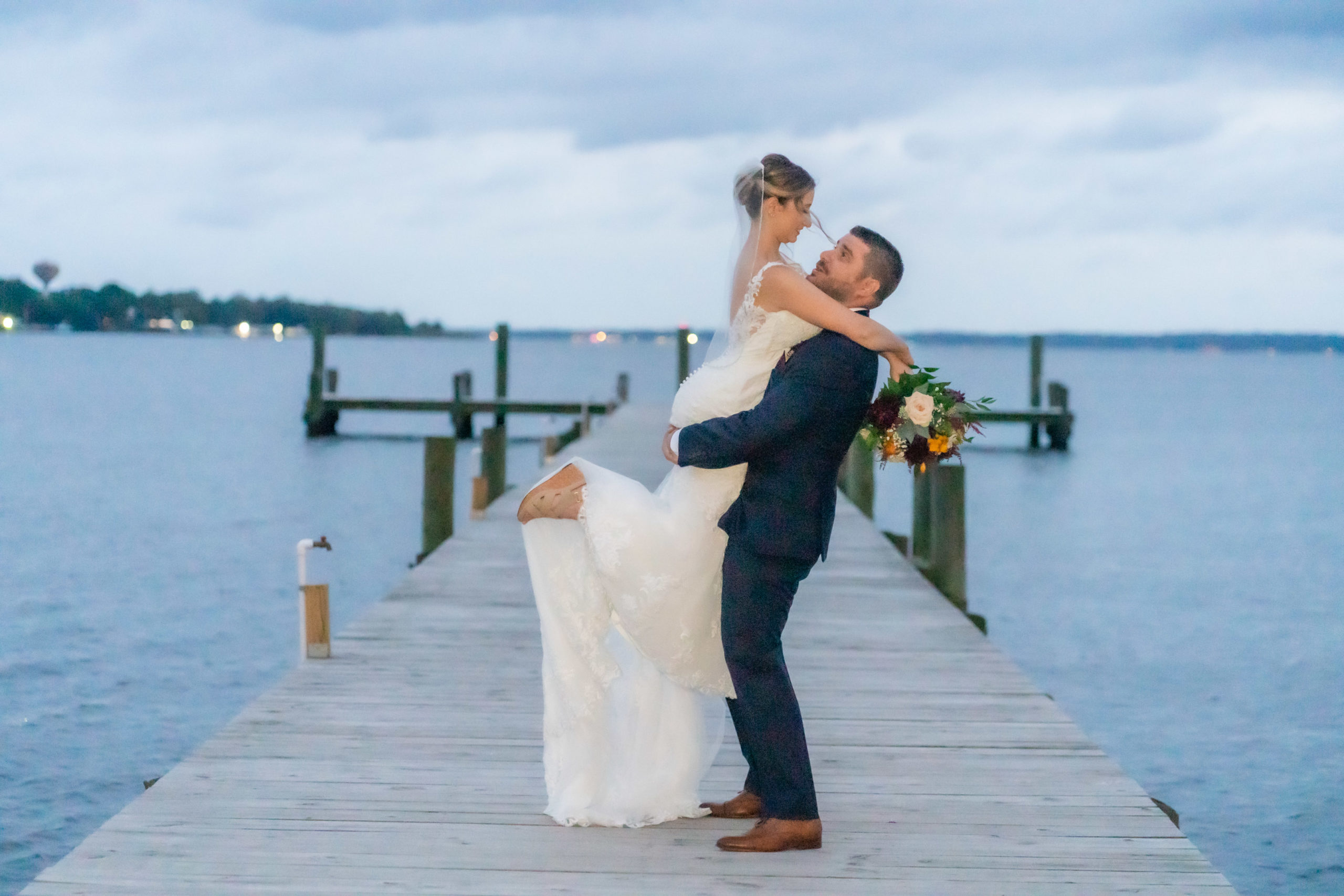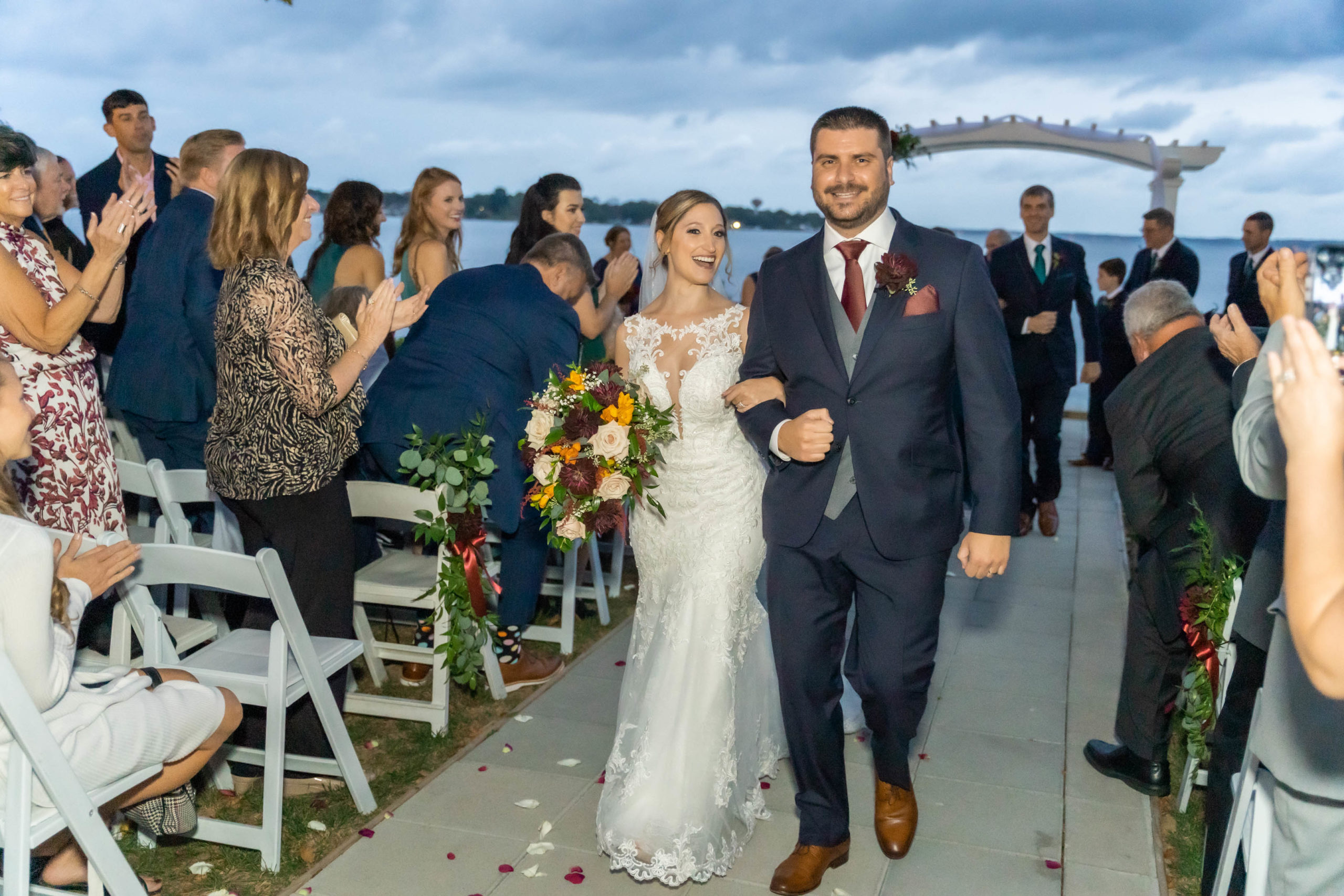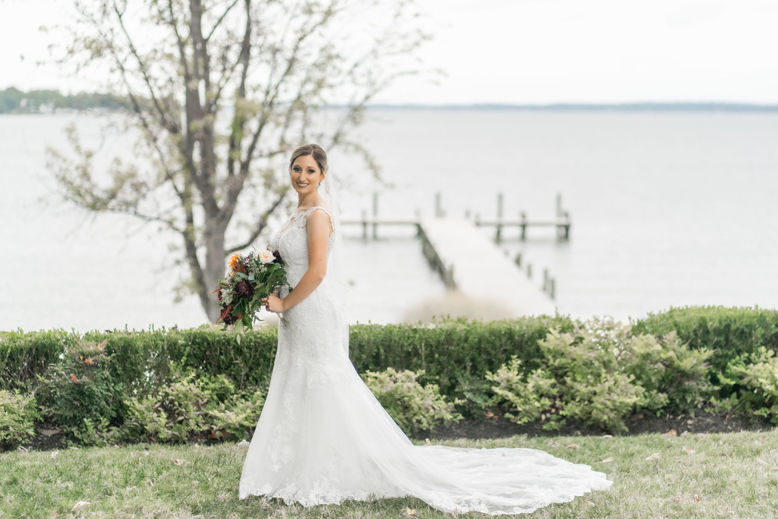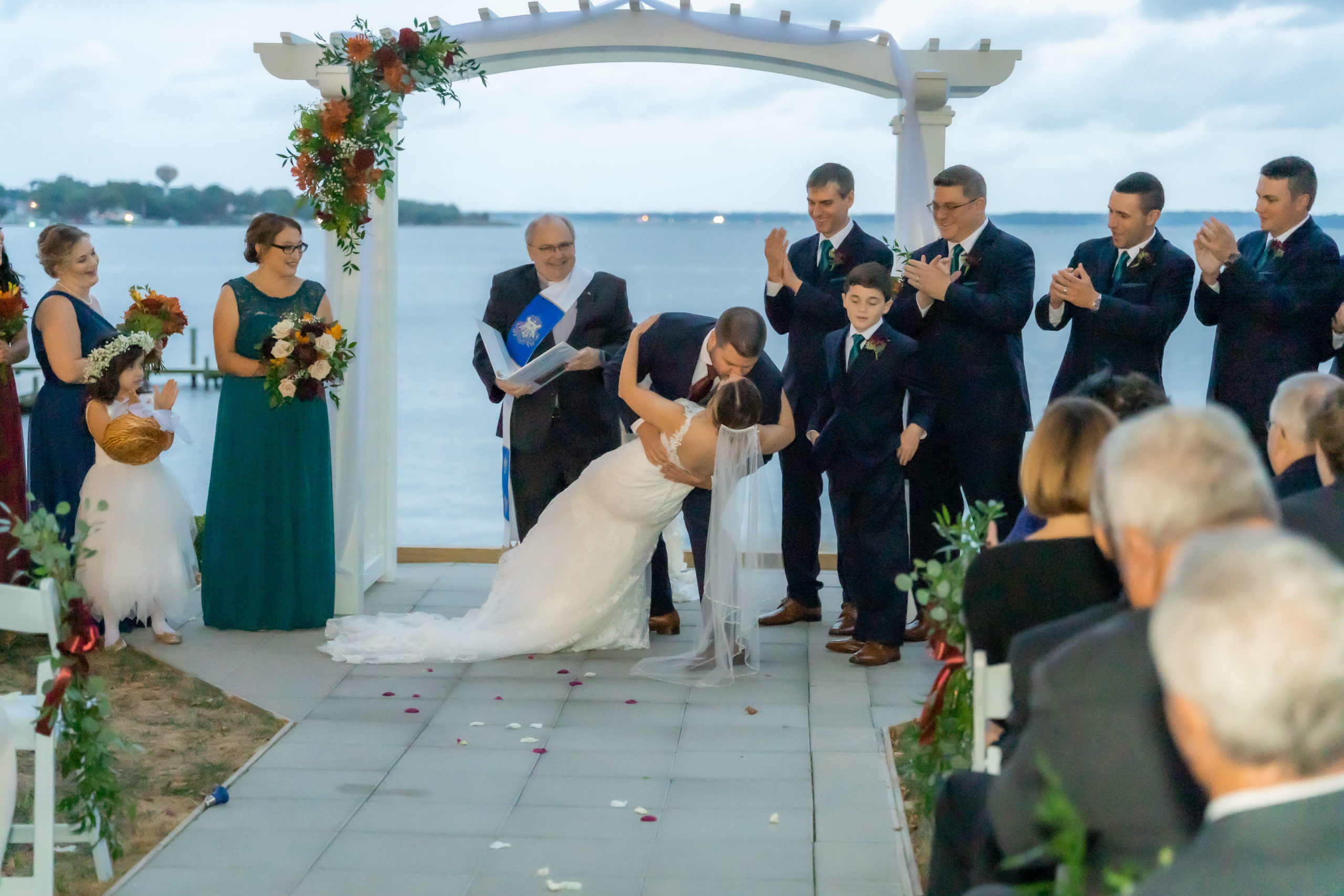 A week ago today, both Rebecca and Patrick, along with their friends and relatives, exchanged their vows and sealed it with a kiss at the beautiful waterfront wedding property known as The Bayfront Club – one of several Catering by Uptown venues in and around Baltimore, Maryland. This venue showcases a beautiful ballroom with windows overlooking the Chesapeake Bay. A large deck overlooks several grass fields, one with an arch for outdoor ceremony. This facility also boasts having a long pier for extra phun, photos, and phestivities!